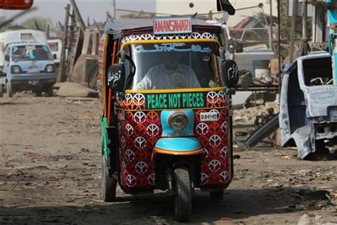 Zaidi is turning that strategy on its head with a fleet of rickshaws emblazoned with peace slogans and decorated with colorful designs similar to those found on many trucks and buses in the country.