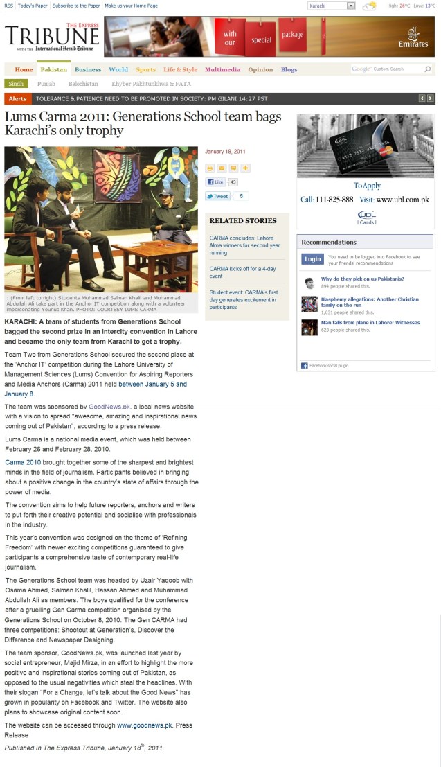 “A piece in Tuesday’s (January 18) edition of The Express Tribune spoke about a website aiming to spread “awesome, amazing and inspirational news coming out of Pakistan”. Upon visiting the website I was surprised to actually read good news.”