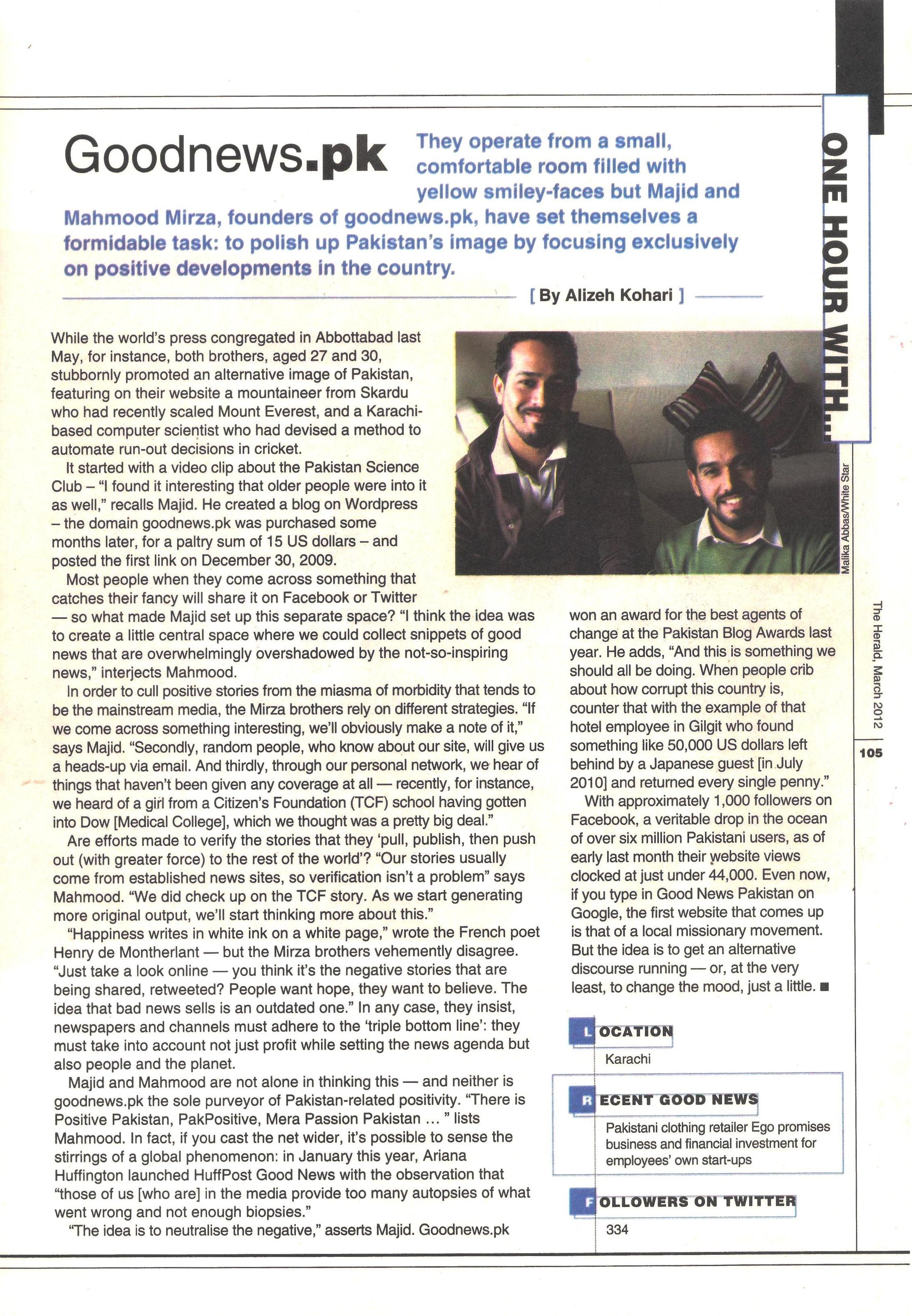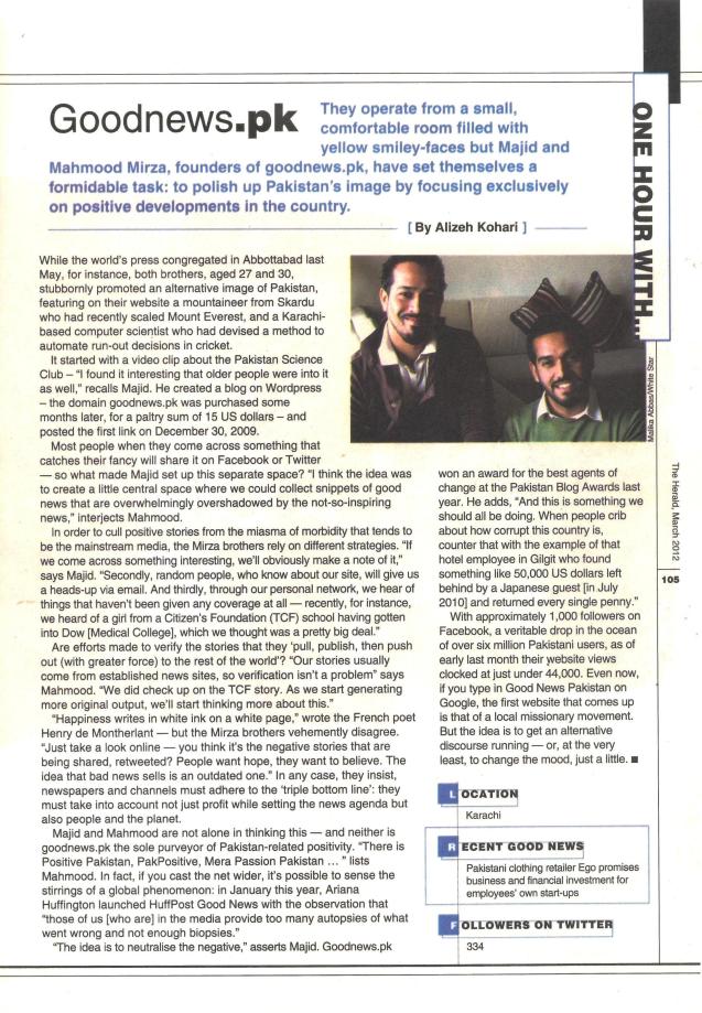 They operate from a small, comfortable room filled with smiley-faces but Majid and Mahmood Mirza, founders of goodnews.pk, have set themselves a formidable task: to polish up Pakistan’s image by focusing exclusively on positive developments in the country.